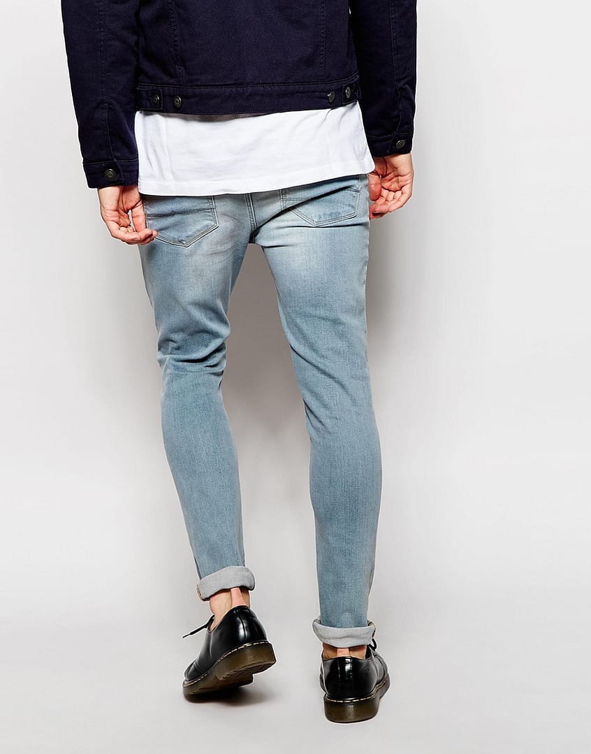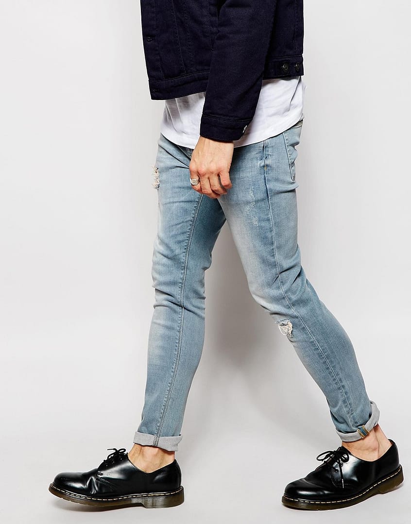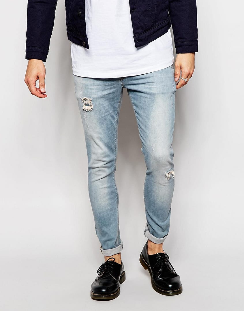 Stretch denim Light wash Zip fly Rip detailing Whiskering to thigh Fading through leg Super skinny fit – cut closest to the body Machine wash 99% Cotton, 1% Elastane