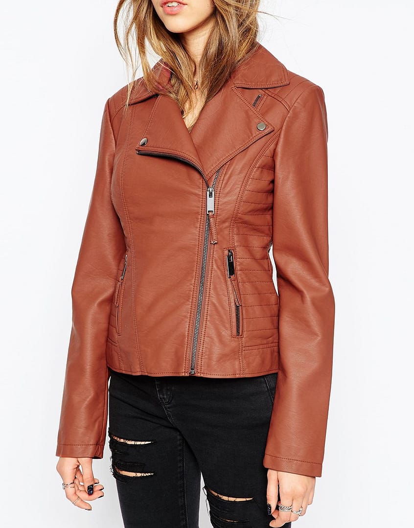 Lightweight supple faux leather Fully lined Lapel collar Zip front fastening Zipped side pockets Regular fit – true to size Machine wash 100% Viscose